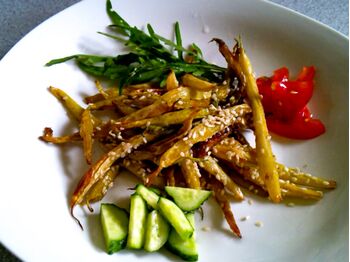 Жареная спаржевая фасоль Ингредиенты: молодая спаржевая фасоль кунжут специи: асафетида , черная соль (можно использовать любые какие вы предпочитаете) Приготовление: спаржевую фасоль хорошо моем, просушиваем полотенцем, если хвостики жесткие - срезаем на сковороде, хорошо нагреваем растительное масло и выкладываем на нее...