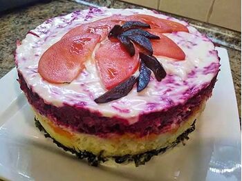 Веганский салат "Шуба" Нам понадобится : 300 грм ламинарии (морская капуста) 3 шт. буряка 3 шт. средней картошки 1 большая морковь Все овощи должны быть отварены или запечены целыми в духовке. У меня соевый майонез 300 грм Соль, асафетида Приготовление : Я использовала сухую ламинарию, поэтому...