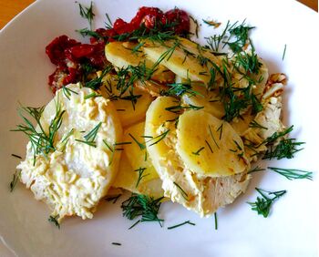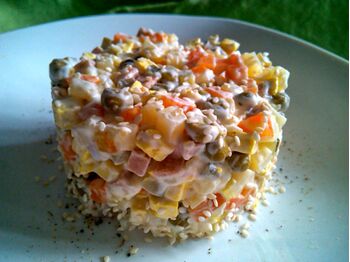 Оливье без яиц Ингредиенты: 6 средних картошек 2 морковки 2 средних солёных огурца 1 банка консервированного горошка 250 грамм тофу 400 грамм постного (веганского) майонеза 400 грамм веганской колбасы от Vegetus (можно и без нее) или можно заменить сейтаном специи для приваривания: 1/4 ч. ложки соли 1/3 ч. ложки куркумы...