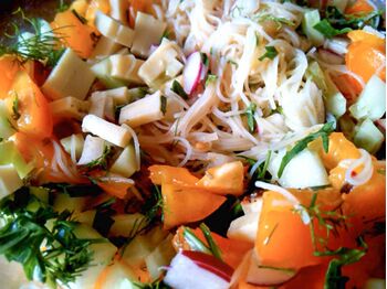 Салат фунчоза с овощами - Фунчоза, как готовить? Фунчоза («стеклянная, крахмальная, китайская лапша») — блюдо китайской, корейской, японской и других азиатских кухонь, которое готовится из сухой лапши с приправами из маринованного перца, моркови, и других овощей. Подаётся в горячем или холодном виде. Ингредиенты: 1/3 пачки рисовой...