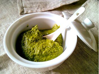 Диетический соус песто - песто из семечек Ингредиенты: 3 пучка базилика (примерно 200 грамм листочков) 120 грамм семечек подсолнечника 2 ч.л. асафетиды (или 5-6 зубчиков чеснока) 150 мл оливкового масла 100 мл яблочного уксуса (или сок лимона) 1 ч.л. соли Приготовление: Все продукты измельчаем в блендере до однородной массы