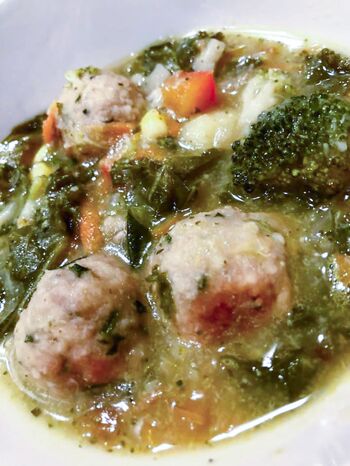 Деревенский суп с фрикадельками р ецепт от Ольги Артемовой (авторский, выкладываю без изменений) ИНГРЕДИЕНТЫ: 2 стакана сваренной фасоли каннелини (или любой другой) 1 маленькая луковица 3 зубчика чеснока (или асафетиду ) 1/2 стакана базилика или петрушки 1 стакан панировочных сухарей 2 стол ложки...